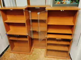 Conjunto de mobiliario para salón compuesto por una vitrina y dos estanterías. - Vitrina con puertas. - Estanterías de pared.