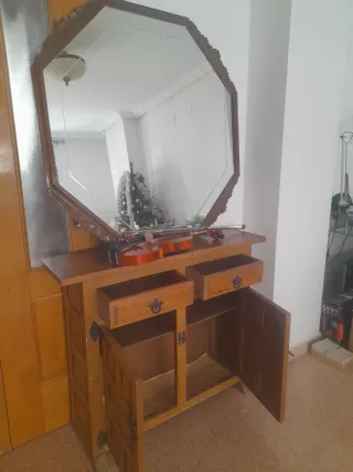 Mueble de entrada con un gran espejo octogonal. - Acabado en madera. - Espejo con marco decorado. - Dos cajones superiores. - Compartimento inferior con puertas.