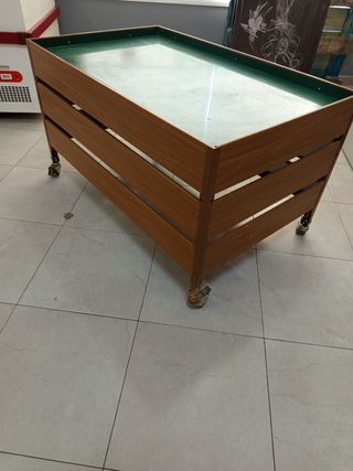 Mesa expositora de madera con tablero verde. Ideal para tiendas o negocios. - Estructura de madera resistente. - Tablero superior de color verde. - Tres estantes inferiores. - Cuatro ruedas para facilitar el movimiento. - En buen estado, con algunas señales de uso.