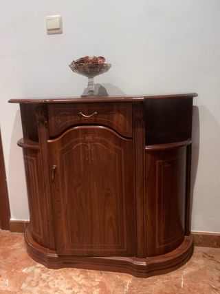 Elegante mueble de madera con un diseño clásico, ideal para recibidores o pasillos. - Acabado en tono marrón oscuro. - Detalles de marquetería en los frontales. - Tirador metálico en el cajón superior. - Puerta central con cerradura y llave.