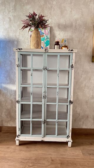 Elegante vitrina con un encantador estilo vintage. Perfecta para añadir un toque de carácter a tu hogar. - Diseño con puertas de red metálica. - Acabado en madera con efecto desgastado.