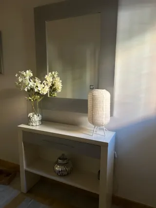 Elegante mueble de entrada con un diseño contemporáneo. - Acabado en blanco y gris. - Combina materiales como madera, cristal y papel. Se incluye la decoración y el espejo