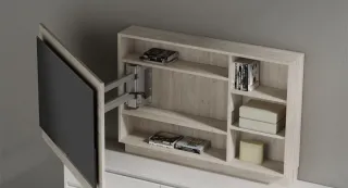 Se vende mueble de TV giratorio de la casa española BAIX MODULS (serie KAY) con gran capacidad de almacenaje y posibilidad de colgar TV de hasta 55 pulgadas. Incluye soporte con cajones y baldas. Se puede añadir mesita de TV elevable y vitrina a juego.