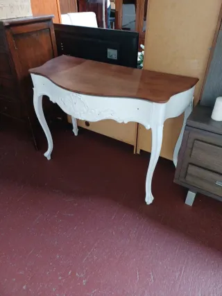 Elegante consola de madera con un diseño clásico. Lacada en blanco y al natural - Encimera de madera con acabado en tono natural. - Base y patas en color blanco. - Detalle ornamental tallado en la parte frontal. Llámenos al 677943055 y le atenderemos
