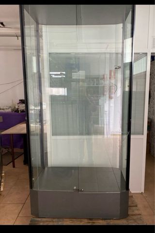 Mueble expositor de cristal con estructura metálica. Tiene un defecto en el lado derecho fácil de disimular con una pegatina No tiene llave - Medidas: 213 cm de alto, 105 cm de ancho y 60 cm de fondo. - Incluye 3 estantes. Se le pueden añadir más estantes