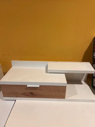 Set de muebles de salón compuesto de: - 1 cajonera con cuatro cajones. - 1 mueble auxiliar. - 1 mueble compuesto por 5 módulos: 1 estantería, 1 módulo mueble con puertas para colgar en la pared, 2 estantes, 1 mueble con puertas, 1 mueble para la televisión con dos cajones y un módulo con una vitrina y puertas en la parte inferior. Mide aproximadamente 2,80 metros de largo. - 1 mesa de centro. Muebles madera a juego. ❗En venta por tiempo limitado. * Buen estado - como nuevo. * Se aceptan ofertas. → Para tu casa, segunda casa o vivienda en alquiler. Más cosas en mi perfil.