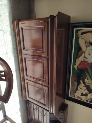 Precioso mueble de salón de madera maciza, color cerezo oscuro. Está en perfecto estado sin ningún rayón ni desperdecto. Diseño elegante y atemporal. - Perfecto para organizar tu salón. - Gran capacidad de almacenaje. - Incluye varios compartimentos y cajones con vitrinas y baldas de cristal y algunos ocultos.