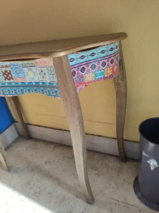 Mueble recibidor con un diseño único y llamativo. - Patas de madera con forma curva. - Frontal de cajones con estampado geométrico multicolor. - Encimera de madera con bordes ondulados.