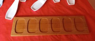 Preciosas cucharas de porcelana blanca para pintxos con soporte de madera,están sin usar pero sin caja, siempre expuesto en vitrina , comprado en corte inglés, tengo más accesorios de la misma colección.