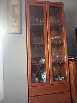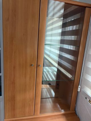 VITRINA DE MADERA BUENA. La vendo porque en un lateral el cristal se ha roto. Y el cristalero no me lo arreglan porqué habria que abrirla por arriba y sacar el cristal roto. Han metido los cristales dentro de la madera. El mueble es de madera buena. Esta nuevo. Poco uso. Pesa. Tiene 4 cajones dentro. dos puertas correderas. Y estanterías. Quien le interese tiene que llevárselo por su cuenta. Tengo ascensor.