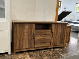 Aparador de madera con un diseño rústico y elegante. Ideal para salones o comedores. HACEMOS ENVIOS A NIVEL NACIONAL A TODO EL PAIS - Acabado en madera de alta calidad. - Dos puertas laterales y dos cajones centrales. - Tiradores negros. - Envío contra reembolso disponible.