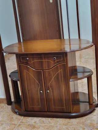 Elegante mueble de madera para la entrada, con un gran espejo. - Cajones para almacenamiento. - Diseño clásico y funcional. Se encuentra en un pueblo a 20 km de Plasencia.