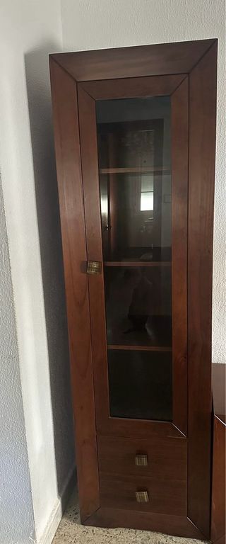 Conjunto de muebles de salón en buen estado.No es aglomerado , es madera. - Mueble de TV con estantes y cajones. - Vitrina alta con puertas de cristal y 3 baldas de cristal. - Estantería.