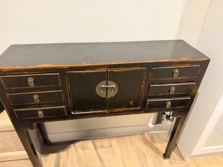 Elegante consola de estilo asiático con un acabado desgastado que le da un toque vintage. Perfecta para añadir un elemento decorativo único a tu hogar. - Fabricada en madera. - Detalles en metal. - Diseño con cajones y puertas centrales.