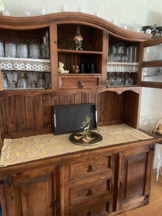 Mueble en perfecto estado, madera maciza, mueble mejicano de madera original, precioso. Decora en cualquier lugar. Puede usarse tambien como mueble para el televisor. Son dos piezas. Hace pocos años me costó 1.770€ Ademas mueble vitrina a juego para vajilla y dos cajones. Lo tengo a la venta por 400€ si te llevas los dos, el precio en lugar de 1.050€ lo dejaria en 900€ los dos.