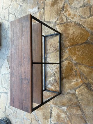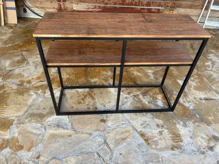 Mueble de recibidor con un diseño moderno y funcional. - Estructura de metal resistente. - Tableros de madera con acabado rústico.