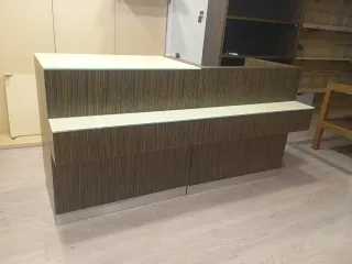 Mostrador de madera en tonos oscuros con betas claras. Parte delantera, madera y cristal con escalón. Parte trasera, varios cajones de gran tamaño, baldas para almacenamiento, 1 cajón para materiales y 3 compartimientos para la caja TPV quede escondida, incluyendo el cajón de monedas.