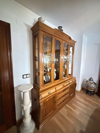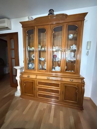 A recoger y desmontar en Reus, el miercoles se lo llevan los del ayuntamiento Mueble de comedor de madera oscura con detalles dorados y puertas de cristal. - Diseño clásico y elegante. - Amplio espacio de almacenamiento con cajones y vitrinas. - Acabado en madera de alta calidad.