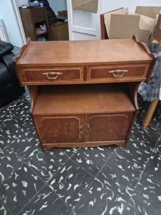 Madera maciza. Le faltan algunos retoques de pintura, la base del cajón habría que cambiarla y en uno de los laterales hay un pequeño golpe. precio no negociable.