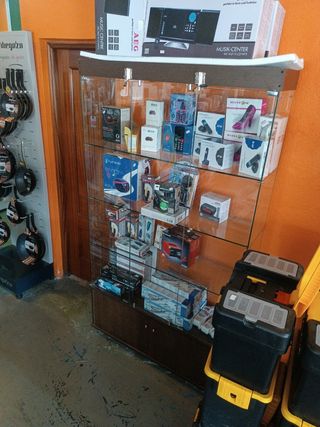 mueble expositor a modo vitrina con luces ,4 valdas y dos cajones para guardar las cajas de los artículos expuestos.