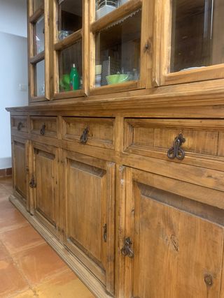Mueble de salón que combina un aparador con cajones y una vitrina con puertas de cristal. - calidad excelente - Diseño de madera oscura. - Tiradores dorados en los cajones. - Puertas de cristal en la vitrina. Medidas vitrina 160*200*40 Medidas aparador 242*92*40 Quien lo compre tendría que desmontarlo y sacarlo