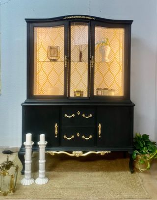No esta disponible, se puede hacer por encargo ! Soy decoradora de interiores y restauradora de muebles antiguos, tengo mi taller en Madrid. Hacemos entrega de muebles por comunidad de Madrid por 40 euros . Si tienes algún mueble que quieres darle otra vida no dudas en contactar conmigo. Presupuesto sin compromiso. Enviamos por toda España.! Vitrina de los años 50, restaurada y pintada a color grafito, con tiradores originales pintados a oro, empapelada por dentro, los cajones están empapelados también. Tiene luz led con su mando, se permite poner varios tipos de intensidad de la luz.