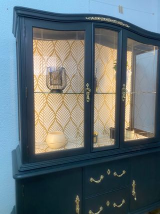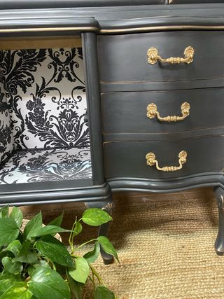 No esta disponible. esta disponible por encargo. Soy decoradora de interiores y restauradora de muebles antiguos, tengo mi taller en Madrid. Hacemos entrega de muebles por comunidad de Madrid por 60 euros . Si tienes algún mueble que quieres darle otra vida no dudas en contactar conmigo. Presupuesto sin compromiso. Enviamos por toda España.! Vitrina de los años 50, restaurada y pintada a color grafito, con tiradores originales pintados dorados, empapelada por dentro, los cajones están empapelados también.