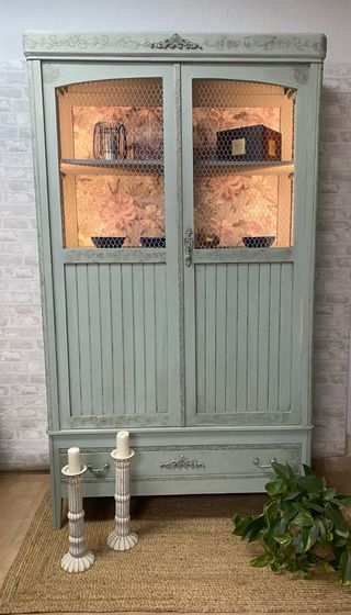 No disponible. se puede hacer por encargo en cualquer color y acabado. vitrina antigua restaurada y pintada a color verde. Restauramos cualquer mueble suyo o buscaremos algun mueble por encargo . Soy restsuradora de murbles, tengo mi taller en Madrid, pide presupuesto sin ningun compromiso. Enviamos por toda España.