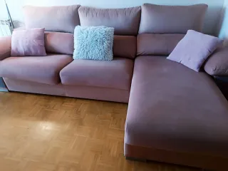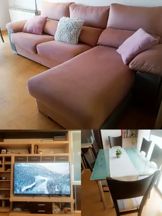 Todo lo que necesitas para tu salón en un solo pack! 😍 Incluye: - Sofá cama italiano 3 plazas + chaiselongue con arcón, color rosa palo. - Mueble de salón modular con estanterías, cajones, vitrina y mueble TV (3,40m de largo, 44 cm profundidad. Mueble TV 58 cm profundidad.) - Mesa cristal y patas de aluminio,extensible 4–6 plazas + 6 sillas madera wengué. Precio negociable. Recogida en domicilio.