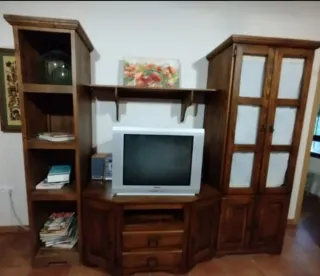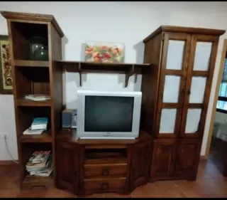 Se vende conjunto de muebles de salón. - Mesa de centro de madera plegable - Mesa alta plegable - Mueble de TV, con tele incluida - Vitrina alta.