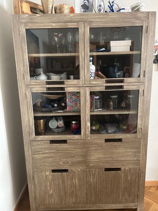 Mueble modular de madera con vitrina superior. - Diseño elegante y funcional. - Puertas de cristal para exhibir tus objetos. - Amplio espacio de almacenamiento en la parte inferior. El mueble son 1,62 largo 45 fondo 69 alto La vitrina 1,40 alto 33 fondo 84 ancho Disponible hasta fin de semana 7/8 de febrero