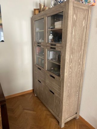 Hermosa vitrina de salón, en roble macizo hecho por ebanistas valencianos. Alto 213 cm, ancho 100 cm y profundidad 43 cm. La base con el visto de madera es de 110 cm. Los estantes son de madera; tres a la vista y cuatro interiores que no se ven desde fuera. Está en perfecto estado, estructuralmente está perfecto, solo tiene alguna marca que se puede ver en la foto, del uso normal diario. Traslado por cuenta de comprador. Precio negociable.