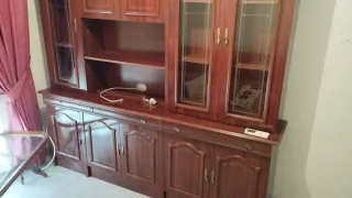 Conjunto de muebles de comedor fabricados en auténtica madera de cerezo. - Mueble vitrina con puertas de cristal. - Mueble bajo con cajones y puertas. - Estanterías decorativas. A recoger en Sevilla