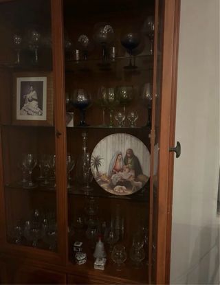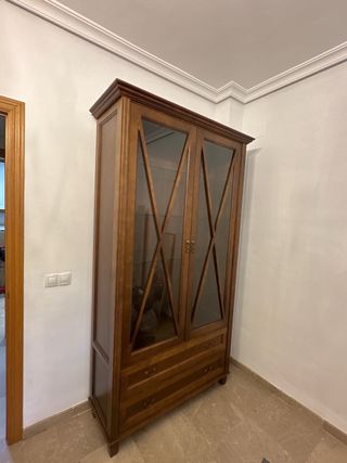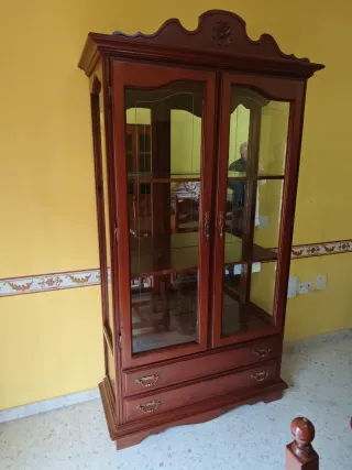 Vitrina de madera de nogal macizo en perfecto estado. Ideal para exhibir tu vajilla o colecciones. - Diseño elegante y clásico. - Puertas de cristal para visibilidad. - Estantes interiores ajustables. Medidas aproximadas. El artículo está por la zona de Dos Hermanas, Sevilla.
