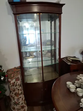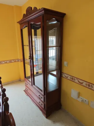 Preciosa vitrina antigua de madera con detalles en dorado. Ideal para coleccionistas. - Tres puertas de cristal. - Dos cajones en la parte inferior. - Estilo clásico y elegante. - Perfecto estado de conservación. (sin decoración) Mesa con 6 sillas y cristal de protecccion Mueble aparador con espejo, dos puertas y 4 cajones todo en muy buen estado