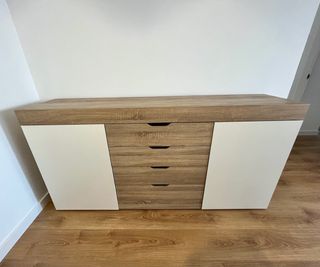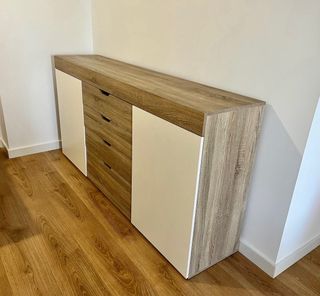 Aparador de diseño moderno con acabado en madera y detalles en blanco. - Cuatro cajones amplios. Uno de ellos roza en la guía al abrir. - Dos puertas laterales con una balda interior.