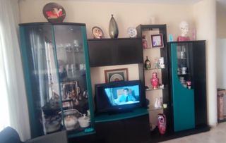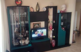 Mueble de comedor en buen estado. Compuesto de cuatro módulos de 90-90-50-75 cm de ancho cada una. Los modulos constan de vitrina y dos cajones bajos. Dos armarios superior e inferior en estructura intermedia (tv) y armario lateral.