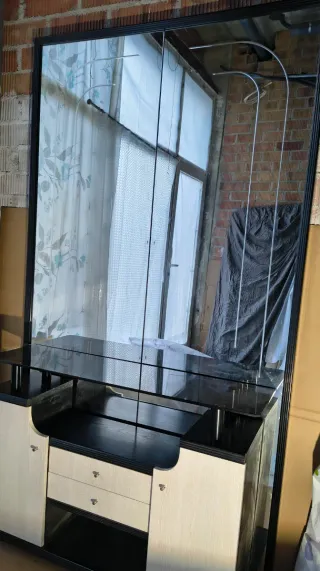 Elegante mueble recibidor con un gran espejo. - Combinación de colores negro y blanco. - Superficies de cristal y madera. Tiene abajo 2 espacios con estanterías y 2 cajones para guardar cosas. Medidas 2,10 alto x 1,20 ancho x 35
