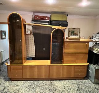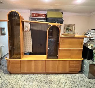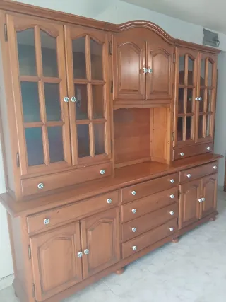 Mueble de salón con vitrina, estantería y aparador. Buen estado. Los tiradores son de porcelana. Medidas: Alto 2,20 m profundo 45 cm largo 2,47 m.. Se encuentra en SANTA POLA. PRECIO A CONVENIR. Escucho ofertas - Diseño clásico en madera. - Puertas con cristal. - Tiradores decorativos.