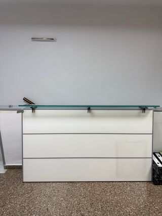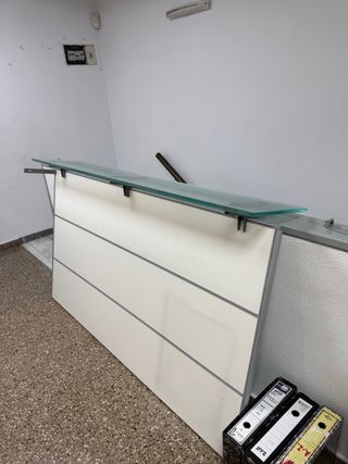 Mostrador de recepción con un diseño moderno y elegante. - Superficie superior de cristal. - Estructura principal en color blanco. - Detalles metálicos.