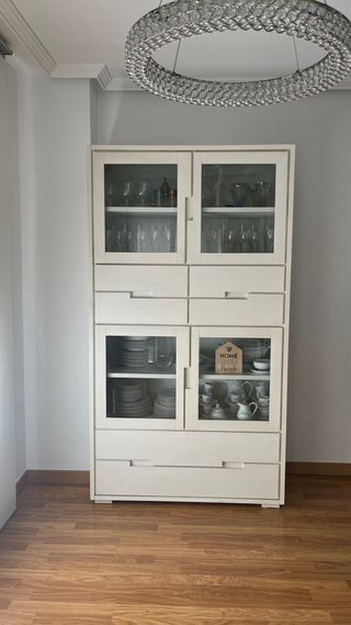 Mueble de comedor con un diseño moderno y elegante con cajones y compartimentos. Va montado por módulos independientes. Por lo que se puede quitar o añadir cualquier módulo. - Estructura principal de madera, la parte de abajo del mueble (300cm ancho - 60cm alto - 47cm profundo). - Vidrieras con puertas y detalles de cristal: Vidriera grande: 161cm alto - 43,5cm ancho - 41,5cm profundo. Vidriera pequeña: 123cm alto - 43,5cm ancho - 36cm profundo. -2 armarios independientes, con amplio espacio de almacenamiento: 90,5cm ancho - 40cm alto - 30,5cm profundo. -Y varias baldas aparte.