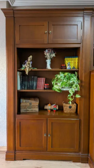 Mueble alacena con vitrina, estantería y aparador. Buen estado. Los tiradores son de porcelana. Medidas: Alto 2,20 m profundo 45 cm largo 2,47 m.. El mueble esta desmontado para que sea más fácil su transporte. Se encuentra en Elche. Escucho ofertas - Diseño clásico en madera. - Puertas con cristal. - Tiradores decorativos.
