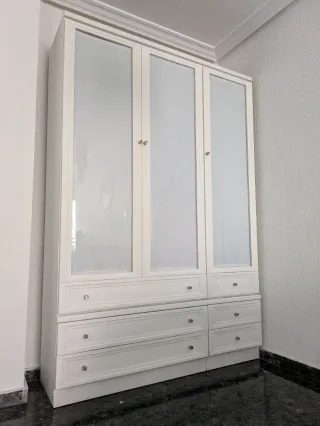 Elegante vitrina de salón en color blanco, perfecta para exhibir tus objetos decorativos. - Diseño clásico con puertas de cristal. - Dos cajones superiores. - Compartimento inferior con puertas. se necesita una pasada mas de pintura y quedaria genial, se observa en la foto. Es de dos piezas la vistrina, no estan juntas por lo que se puede separar Pesa mucho muy elegante