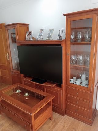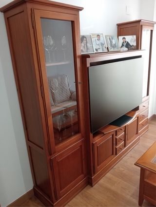 Conjunto de muebles para salón, ideal para tu televisor y almacenamiento.Mueble televisor con ruedas medidas 1,20 de largo por 66 de altura y 50 de profundidad y vitrina 60 de ancho por 1,40 de altura por 40 profundidad más muebles en mi perfil dispongo de furgoneta - Mueble bajo con puertas y estantes. - Mueble alto tipo vitrina con estantes. - Acabado en madera.