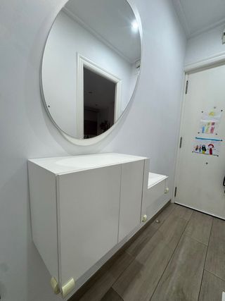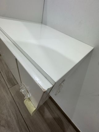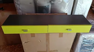 Mueble consola con un diseño moderno y elegante. - Acabado exterior en color beige. - Dos cajones frontales con veta de madera en tono marrón. - Cajones con push, a presión - Medidas: 80cm largo x 30cm ancho x 20cm alto - Medidas cajon: 37cm ancho frontal, interior 32cm ancho x 23cm fondo x 12cm alto. - Cajon interior madera beige veteado - Esquina superior posterior con un golpe (ver foto) que hay que reparar o poner escuadra. Y una esquina inferior posterior algo rajada (ver foto) también para reparar. - Nueva. La entregaron mal, con esos golpes y nunca la reparamos ni la usamos. No pudimos devolverla.