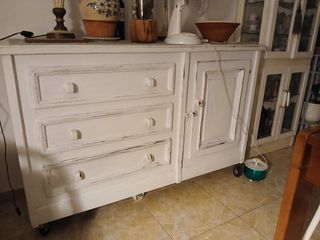 Mueble alacena de estilo rustico, perfecto para tu salón o comedor. Blanco efecto envejecido, NUEVO pintura a la tiza, lijado y tratado con cadena para efecto rustico antiguo, tiradores y cierre tipo pueblo años 50. Puse ruedas para cómodo movimiento, MADERA MACIZA, foto con el diametro de la madera UNA PASADA!! -Puede usarlo como isla o separacion en una cocina abierta (fotos) - Diseño con tres cajones y una puerta. - Acabado en madera con un toque envejecido.