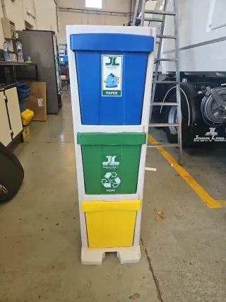Torre de reciclaje con tres cubos apilables, ideal para separar residuos. - Cubo superior de color azul con etiqueta PAPEL. - Cubo intermedio de color verde con símbolo de reciclaje. - Cubo inferior de color amarillo.