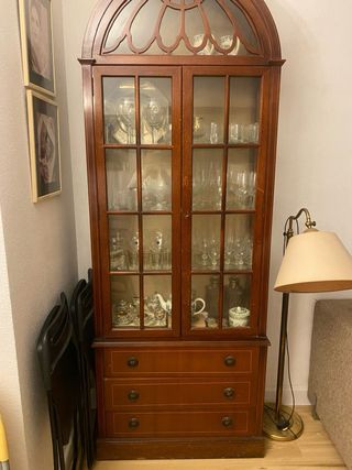 vitrina mueble clasico color caoba , tiene unas manchas de decoloracion ,no incluye ni cristaleria ni juego de cafe ni nada de su interior