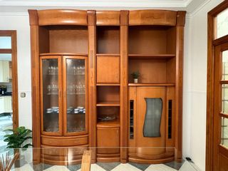 Mueble de salón de madera compuesto por varios modulos y una vitrina. 240 cm ancho. - Diseño clásico en madera. - Vitrina con puertas de cristal. - Compartimentos inferiores con puertas y cajones.