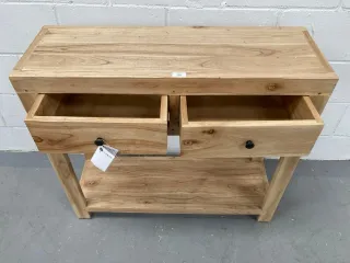 Consola de madera de mindi natural de ADDA HOME. Cuenta con dos cajones y mide 90x30x80 cm. Añade un toque cálido y natural a tu hogar, además de proporcionar espacio de almacenamiento adicional. Hecho con una madera resistente y duradera, esta consola es perfecta para cualquier espacio de tu hogar. Estado: Nuevo a estrenar,PRECIO RECOMENDADO 439 Euros
